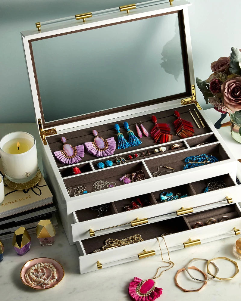 Viste tu tocador y mantén tus joyas organizadas con nuestro joyero grande. Diseñado para el coleccionista, este organizador de joyas cuenta con una parte superior para lucir sus accesorios, separadores de cajones e incluso un compartimento inferior para sus anillos y collares llamativos.